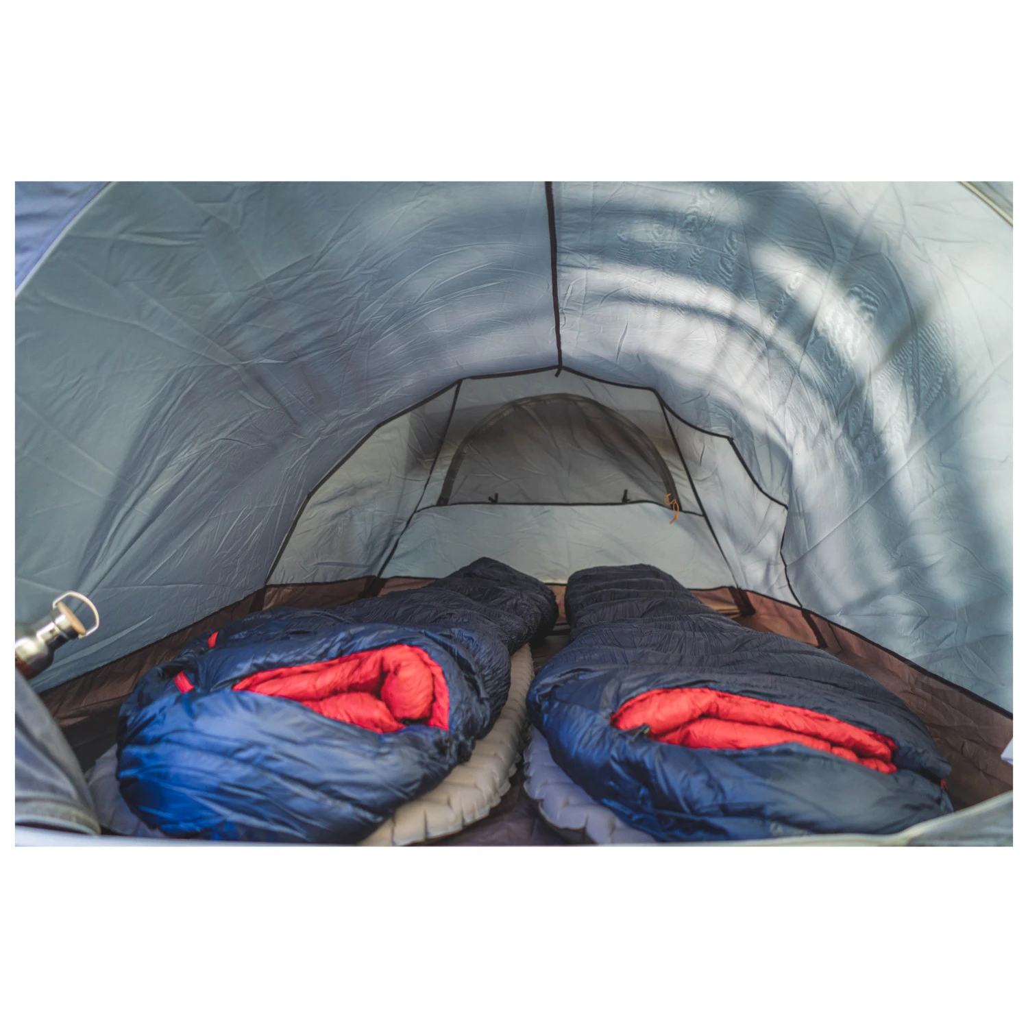 Im Innenzelt befindet sich eine Tasche, mit der Du beim Verstauen der Ausrüstung Ordnung schaffen kann. An den Befestigungsschlaufen im Innenzelt sind zusätzlich Dinge, wie beispielsweise eine Lampe, zu befestigen. Der Ausgang des Zeltes hat außerdem eine Tür aus Moskitomesh. So ist für ausreichend Belüftung im Zelt gesorgt, ohne dass lästige Stechmücken hindurchkommen. Reflektierende Schnüre sind praktisch bei Dunkelheit und – hält man sich draußen in der Nähe des Zeltes auf – man stolpert nicht versehentlich über die gespannten Schnüre! Zum Transport oder Aufbewahren kann das Kjevik 3 platzsparend im mitgelieferten Packsack verstaut werden.