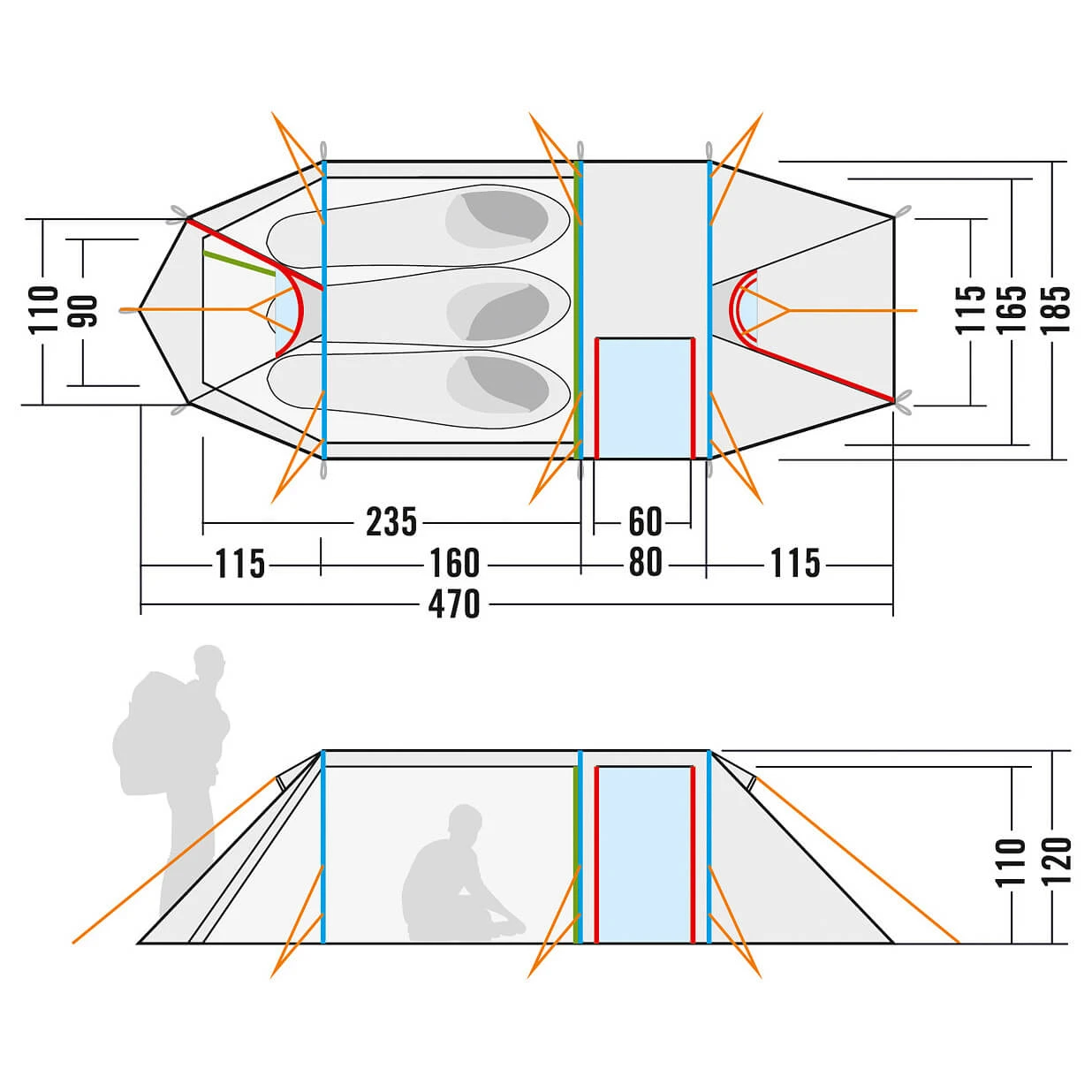 Das Zelt wird mit drei Aluminiumstangen aus 7001 Aluminium (9,5cm) aufgestellt. In der großzügigen Apside gibt es viel Platz zum Kochen und große Rucksäcke. Durch die zwei separaten Eingänge kann man schnell und einfach in den Innenraum gelangen. Ein dritter Eingang an der Rückseite ermöglicht eine perfekte Ventilation an warmen Tagen. Zwei zusätzliche Lüfter, die von Innen bedienbar sind, reduzieren Kondensationsfeuchte und sorgen selbst an Regentagen für frische Luft.